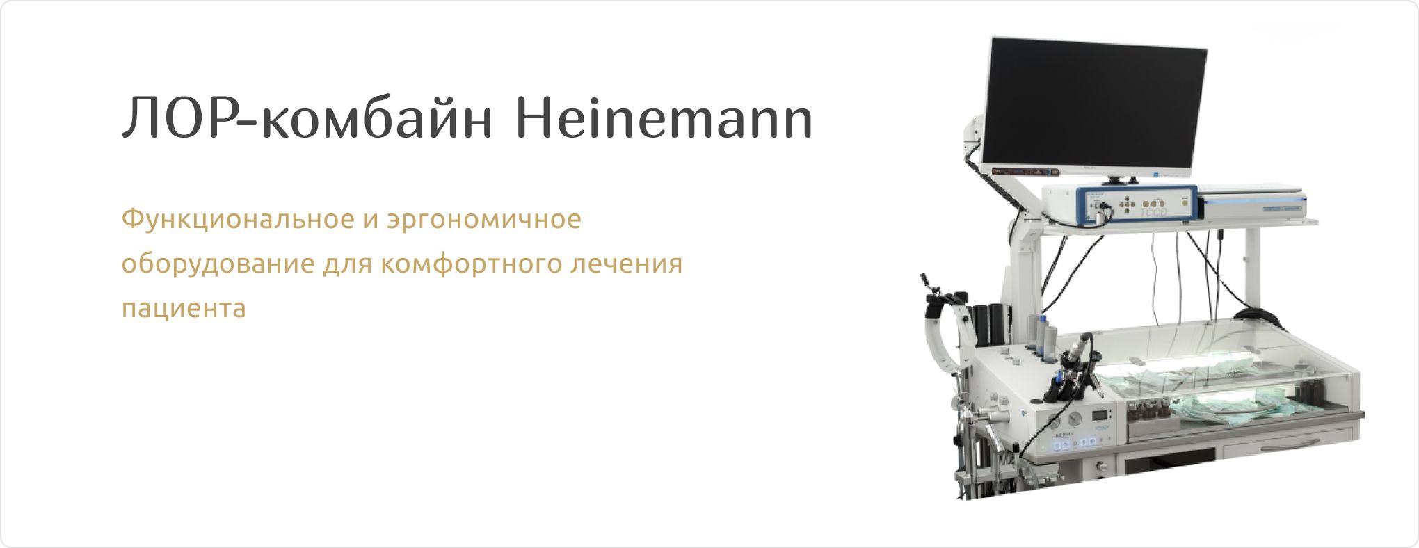 В нашей клинике используется современная ЛОР-установка немецкой компании Heinemann. ЛОР-комбайн включает в себя необходимый перечень функций и приборов и позволяет проводить своевременную диагностику и лечение заболеваний уха, горла и носа.