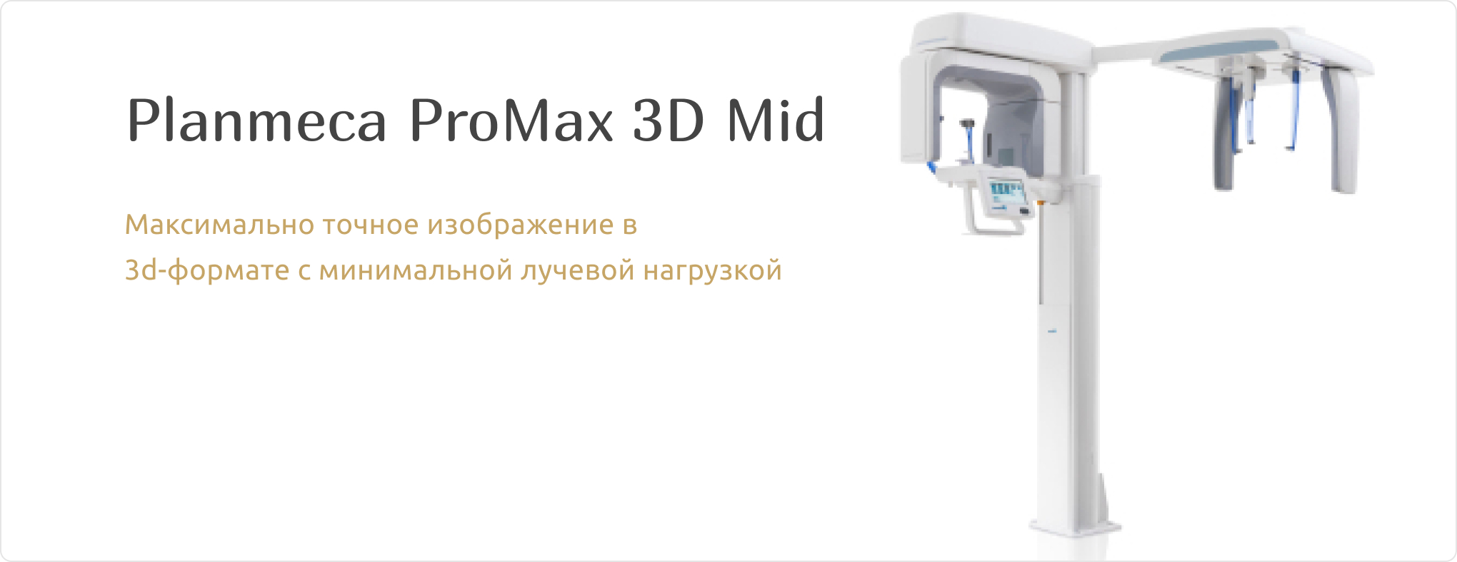 Для проведения рентгенодиагностики используется установка Planmeca ProMax 3D Mid (Финляндия), которая позволяет получать качественные трехмерные изображения, позволяющие провести оценку органов и тканей, поставить правильный диагноз, вовремя выявить скрытую проблему и провести виртуальное 3D-моделирование предстоящего лечения.
